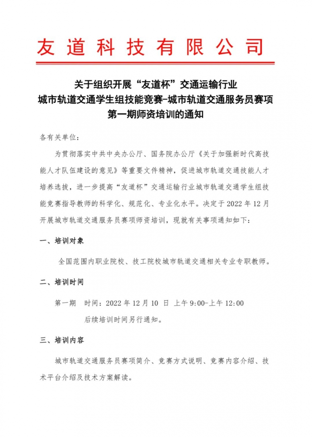關于組織開展“友道杯”交通運輸行業城市軌道交通學生組技能競賽-城市軌道交通服務員賽項第一期師資培訓通知