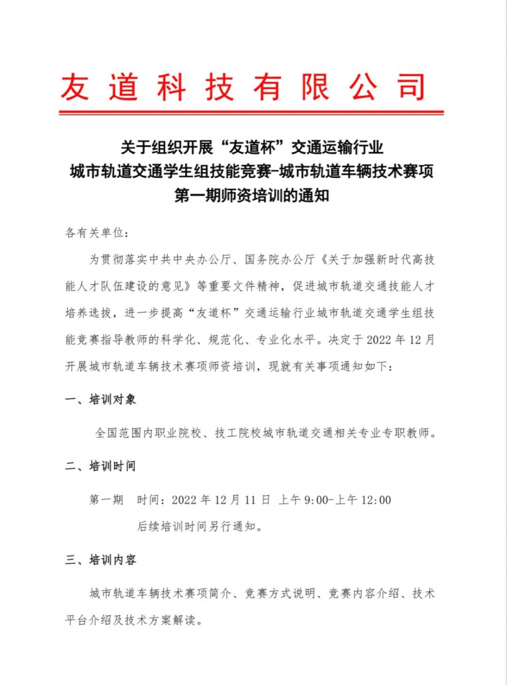 關于組織開展“友道杯”交通運輸行業(yè)城市軌道交通學生組技能競賽-城市軌道交通服務員賽項第一期師資培訓通知